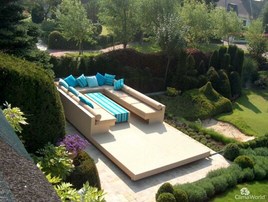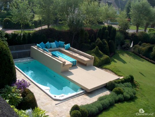 Het bewegende terras schuift over het zwembad. Zo kan jij met een gerust hart