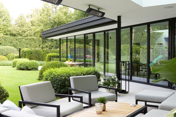 Stijlvolle uitbouw met strakke steellook en aanpalende pergola